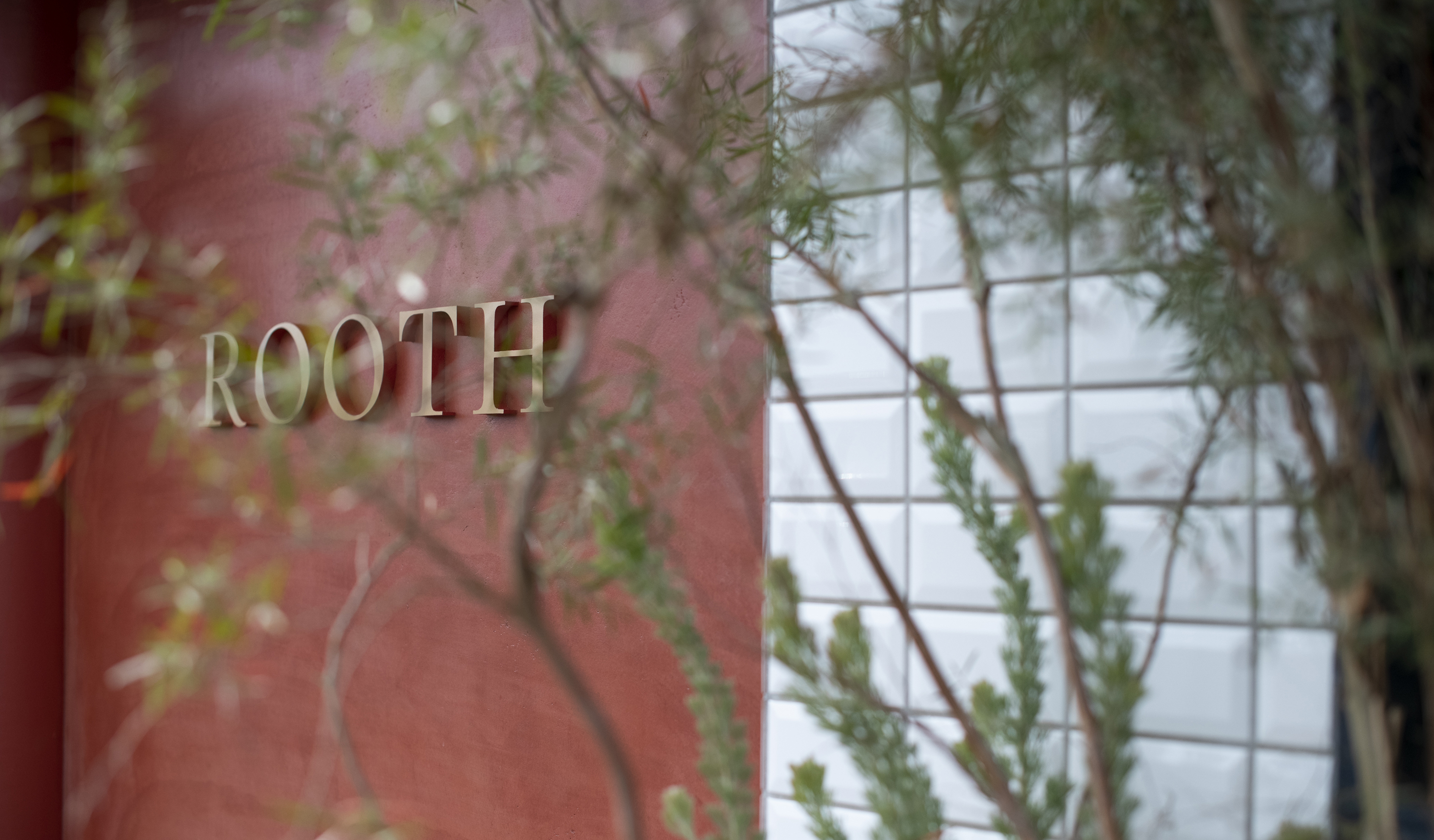 ROOTHのテイクアウト開口を中心に飲食のエントランスから物販のエントランスまでをお客様の賑わいで繋ぐ配置にし、そこをROOTHカラーのレンガ色で染め既存の白い建物に差し込むデザインとした。