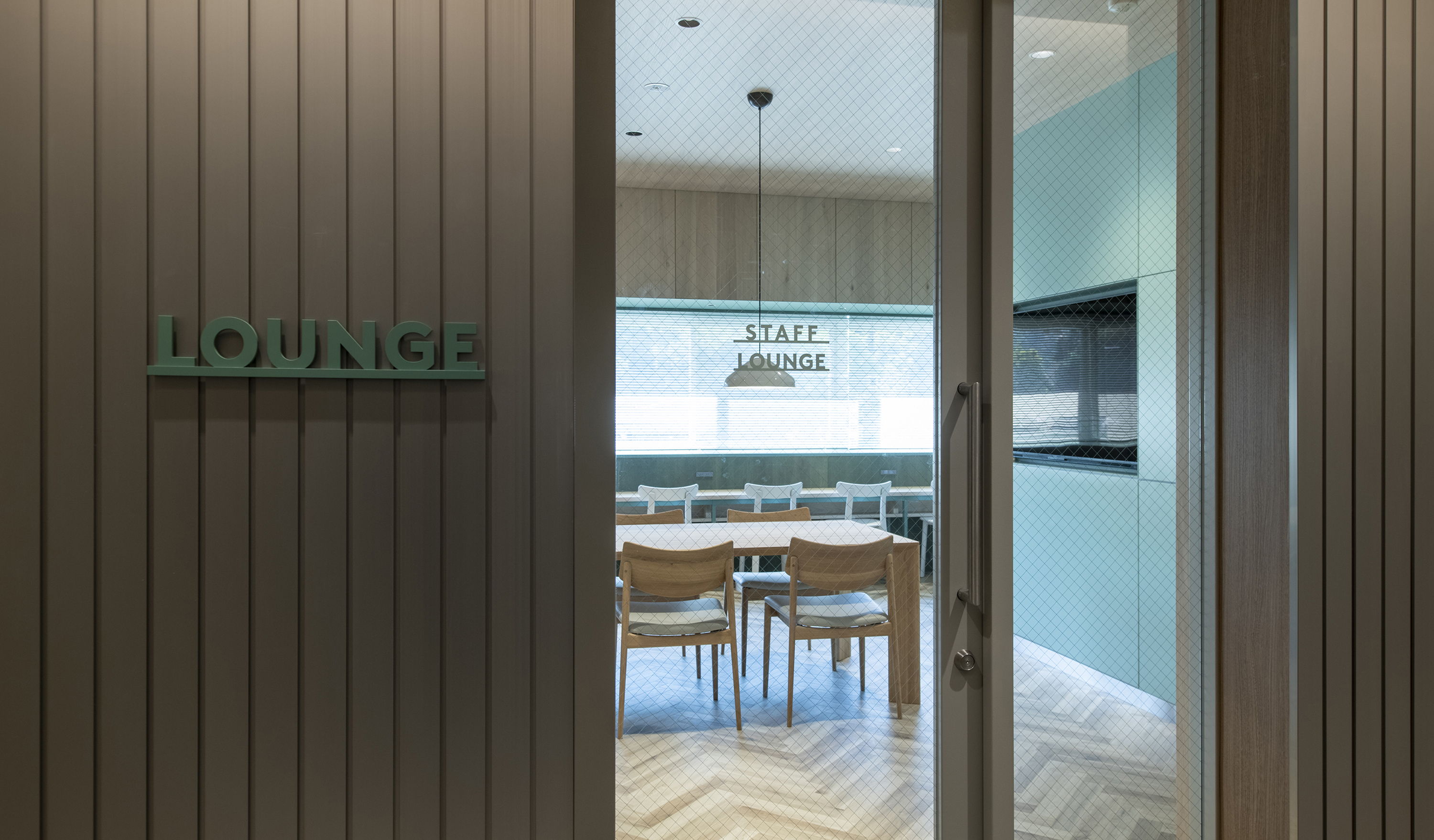 グリーンにフォーカスしてインテリアを構築。平面計画が複雑で居場所にヒエラルキーが生まれないよう極力シンプルに構成し、その日の気分に任せて好きな場所で休憩できるように配慮した。構造計画で大きな耐風梁が外壁側に計画されていた事から、ボリュームを持たせた下がり壁をラウンジの半分に配置しその部分の低い天井の高さが居心地を良くする。