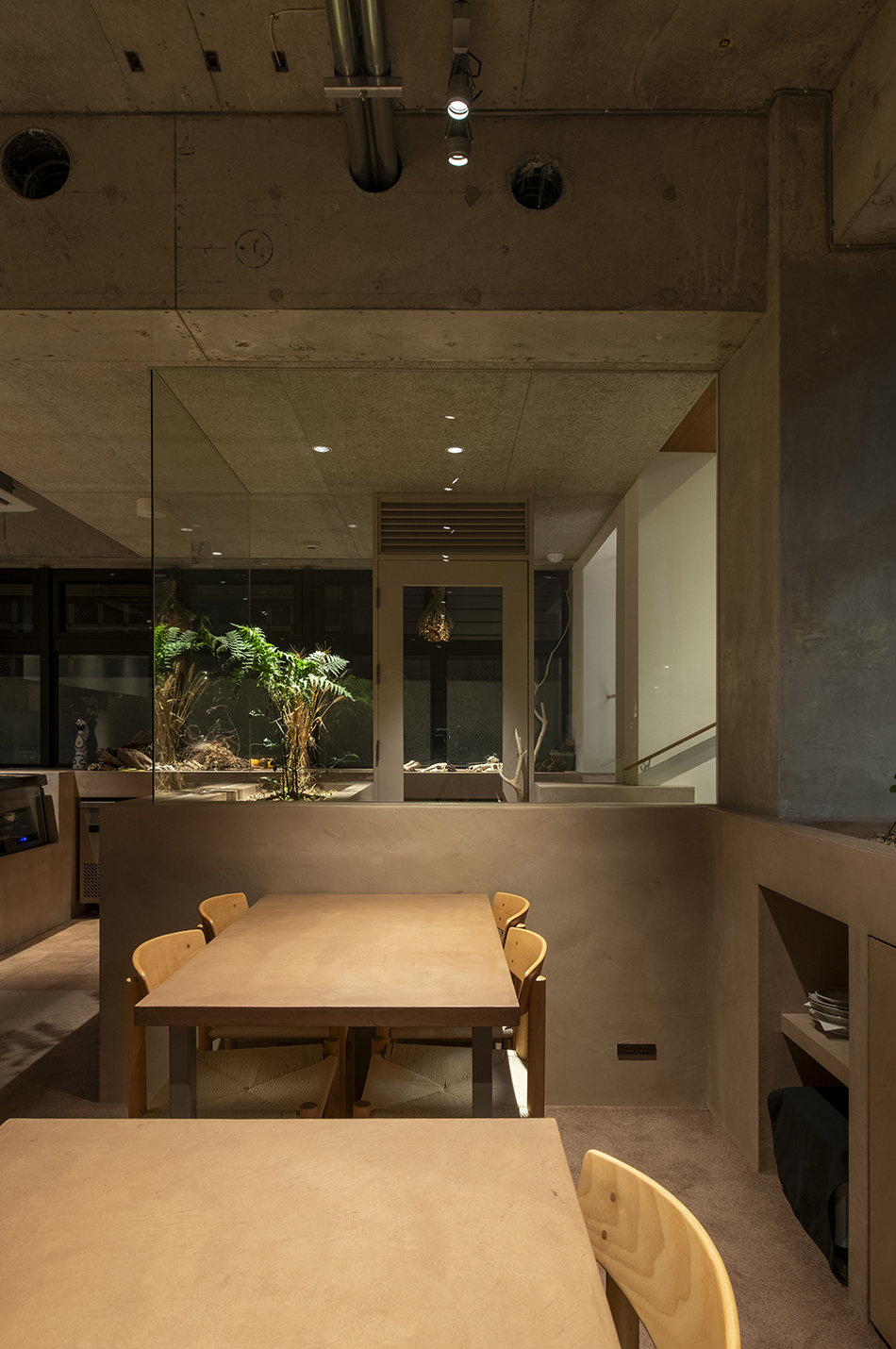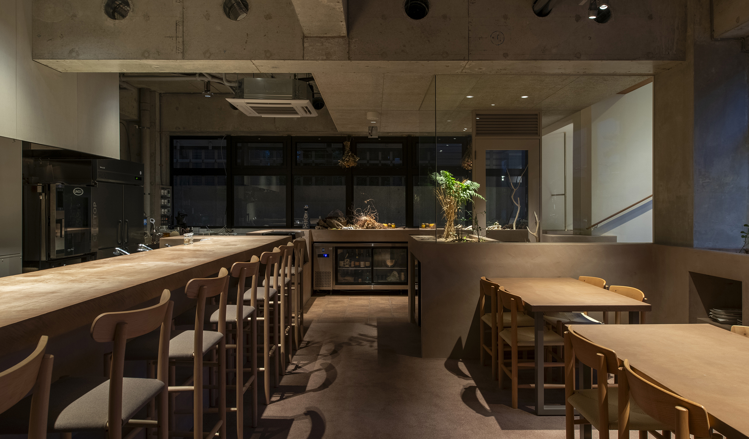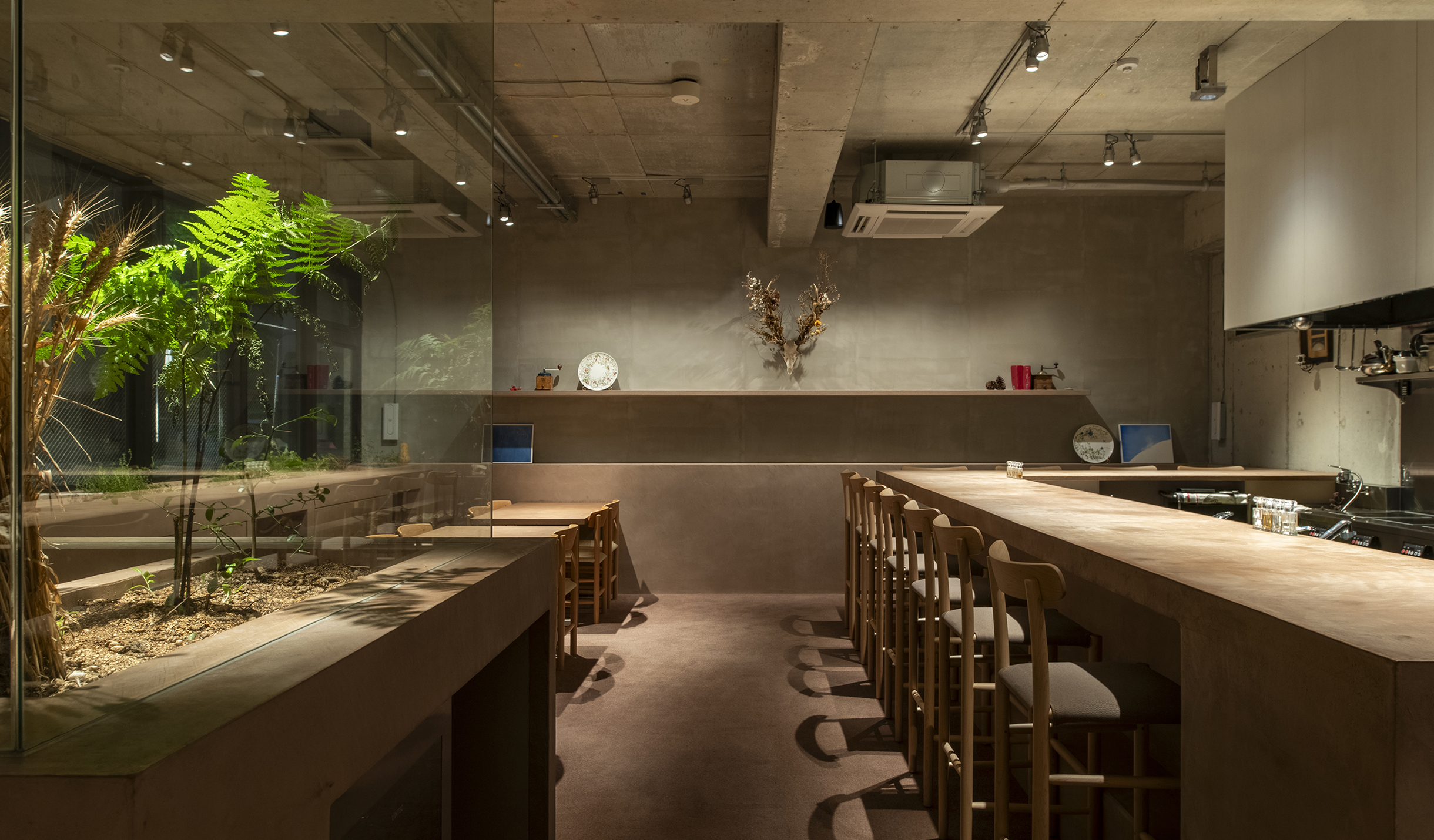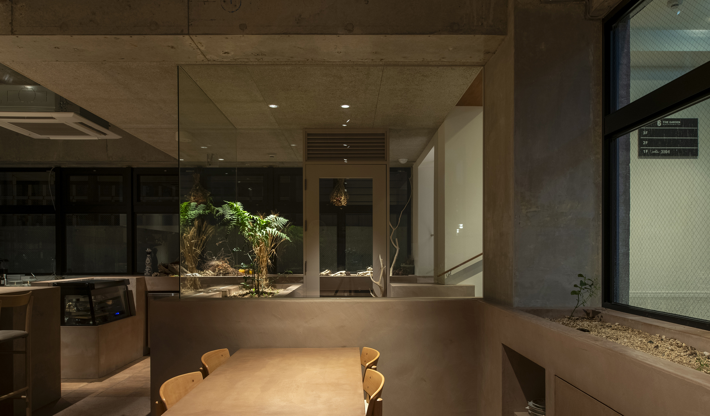 中村氏の食材に対する姿勢から着想し自然の中で食事をするシーンを作りたいと考えた。半地下のテナントは地面(グランドレベル)からマイナス1M。そこを地中と捉え、カウンターやテーブルを土から掘り起こすイメージでインテリアを構築。窓際には地面と同じレベルにお店で使われるハーブ畑を設けた。