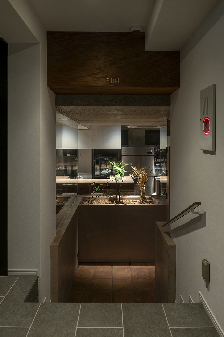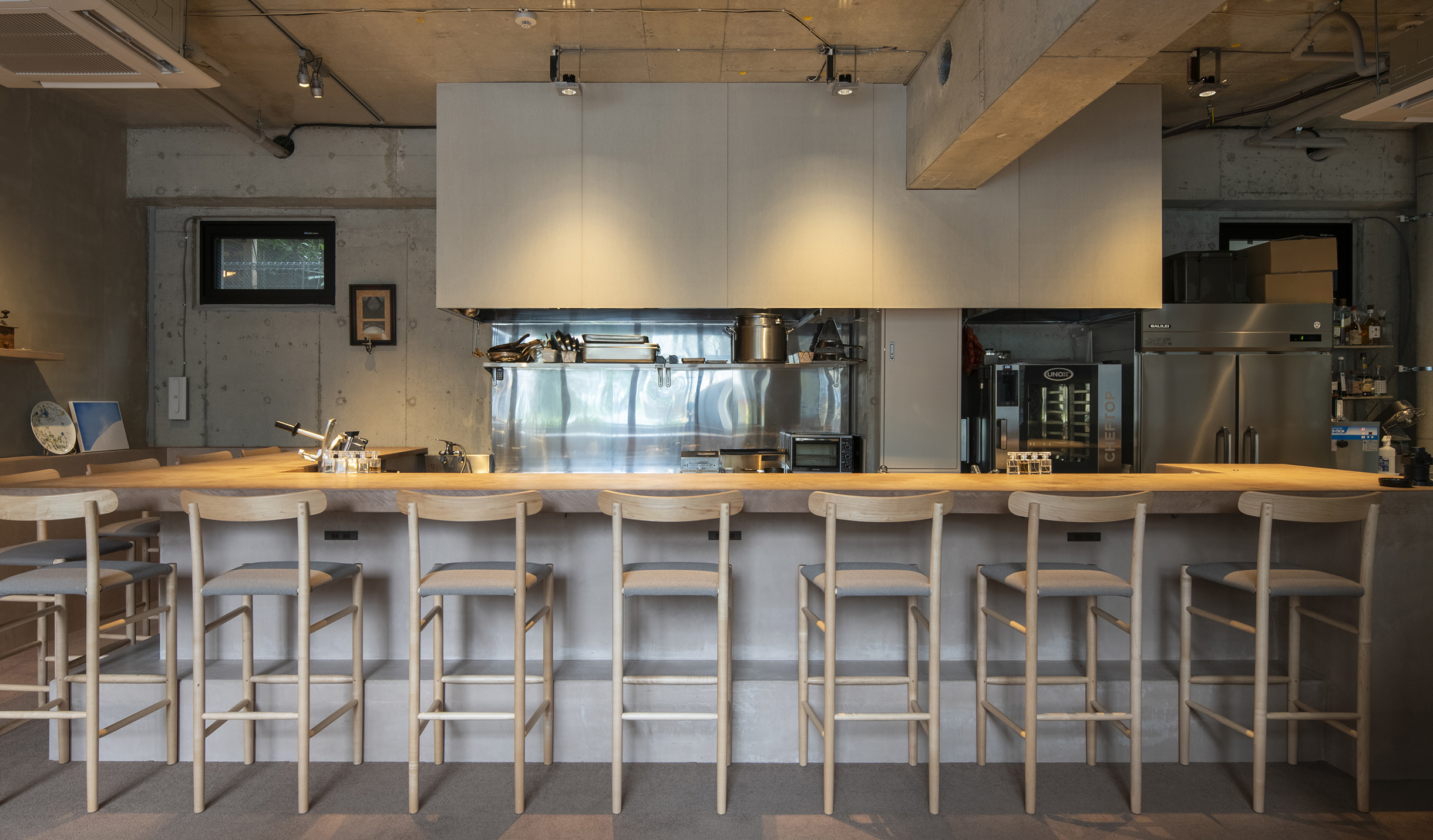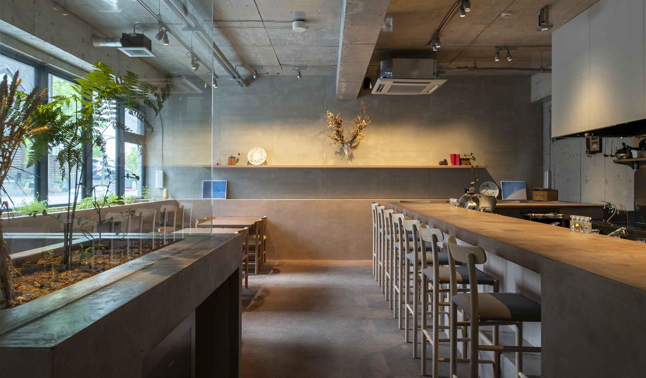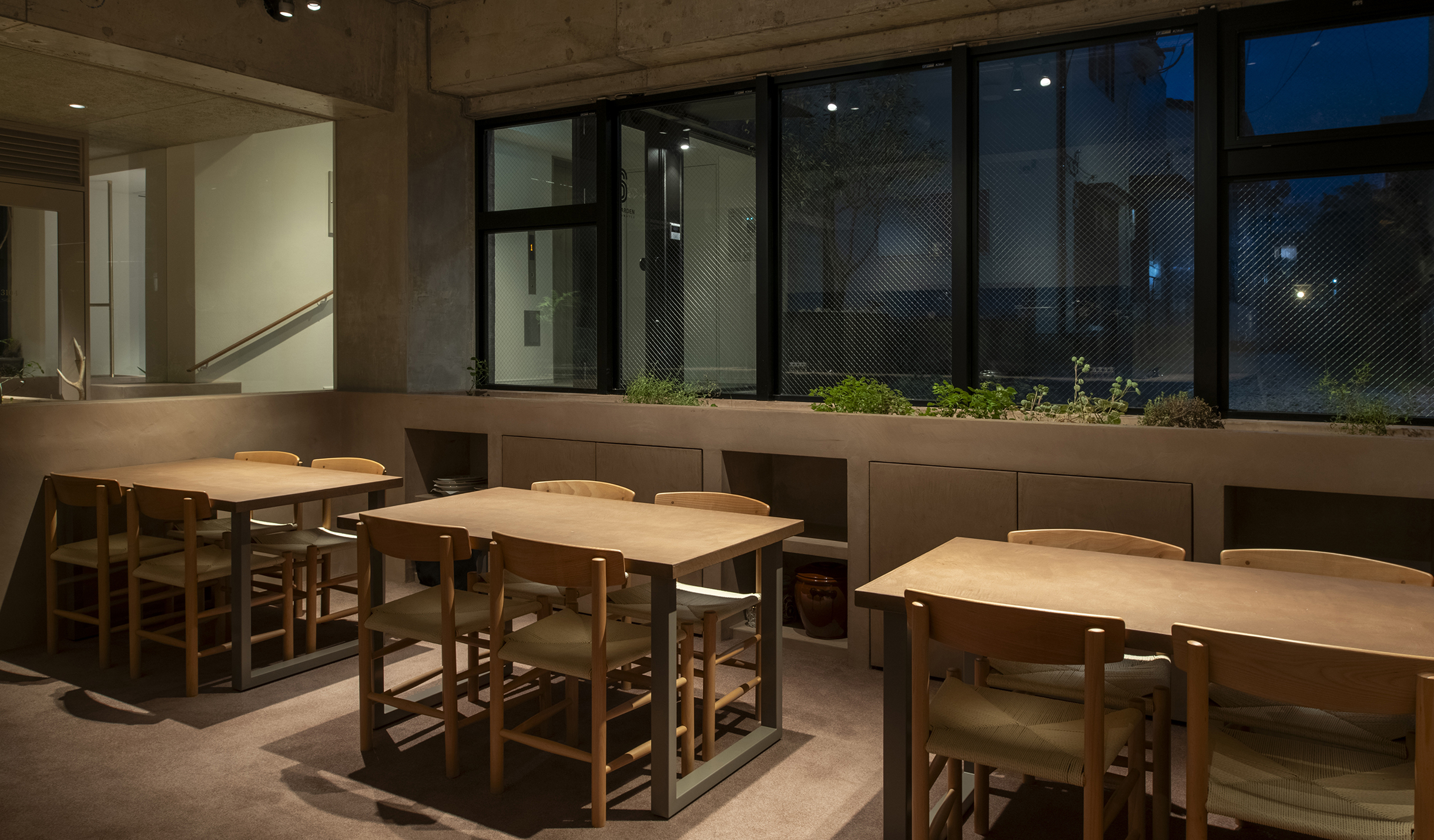 中村氏の食材に対する姿勢から着想し自然の中で食事をするシーンを作りたいと考えた。半地下のテナントは地面(グランドレベル)からマイナス1M。そこを地中と捉え、カウンターやテーブルを土から掘り起こすイメージでインテリアを構築。窓際には地面と同じレベルにお店で使われるハーブ畑を設けた。