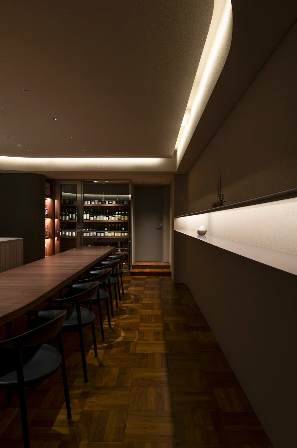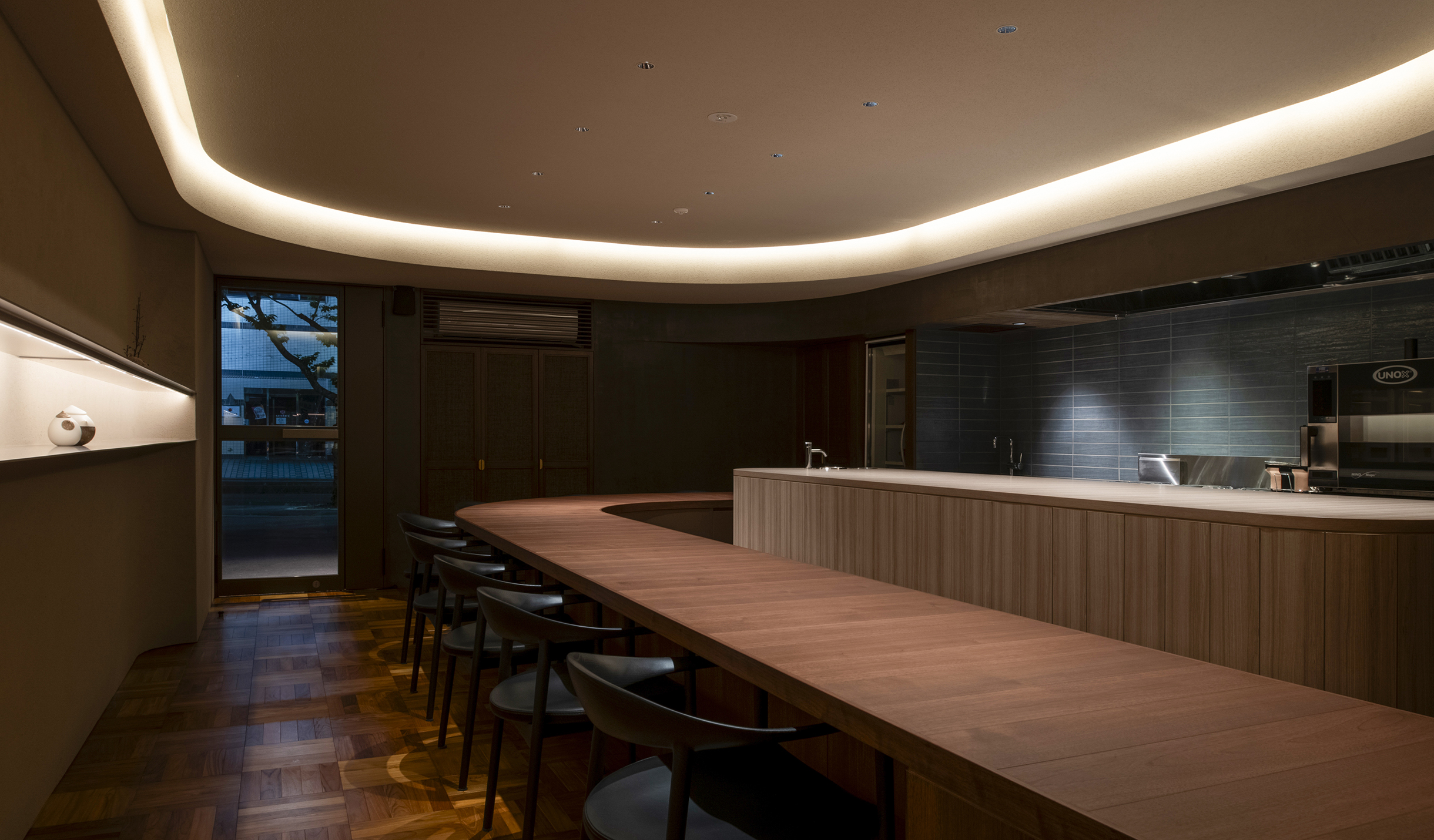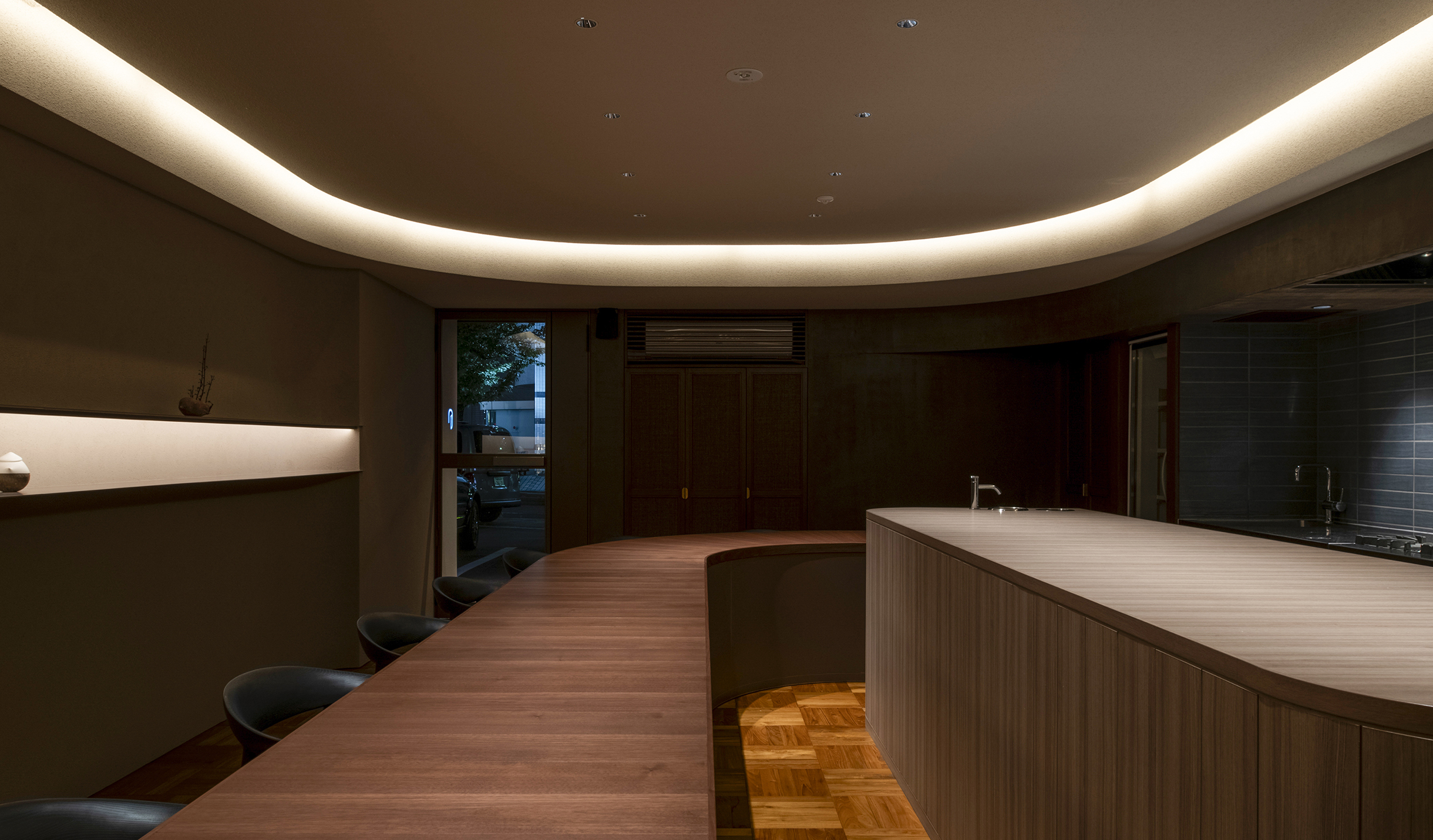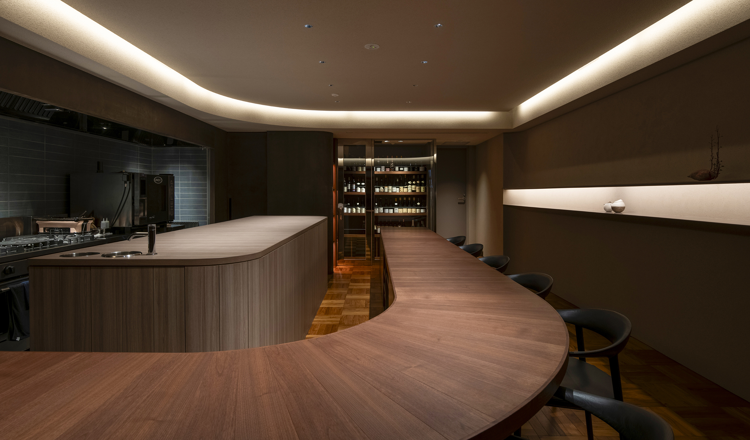 カーブの空間は食との感動の出会いの場として柔らかく店内を引き立てる。横田氏の創作の場を空間の中心に置き、アール形状のカウンターがそれを囲む事で一体感を生み提供される料理の過程を楽しむことができます。