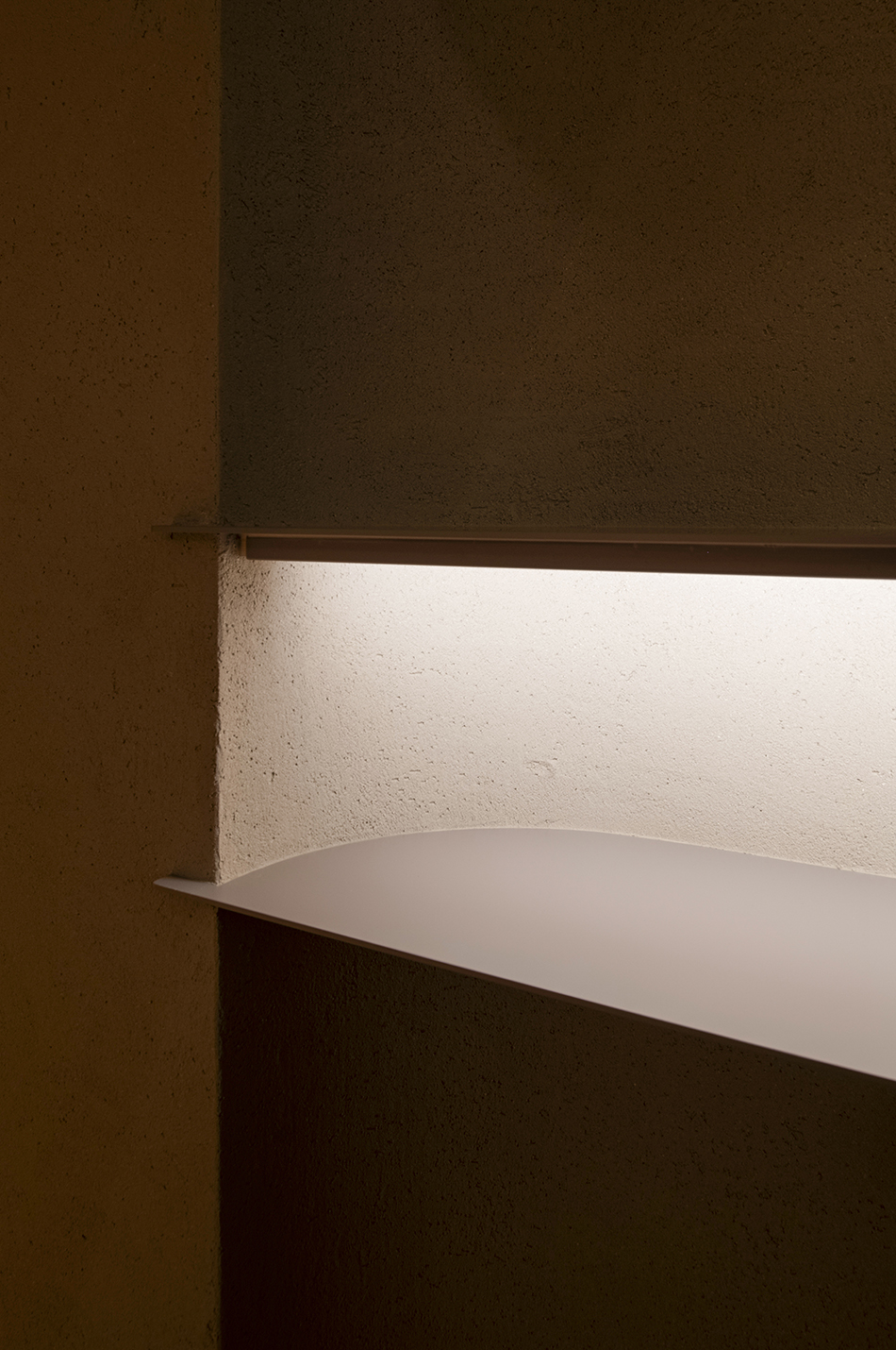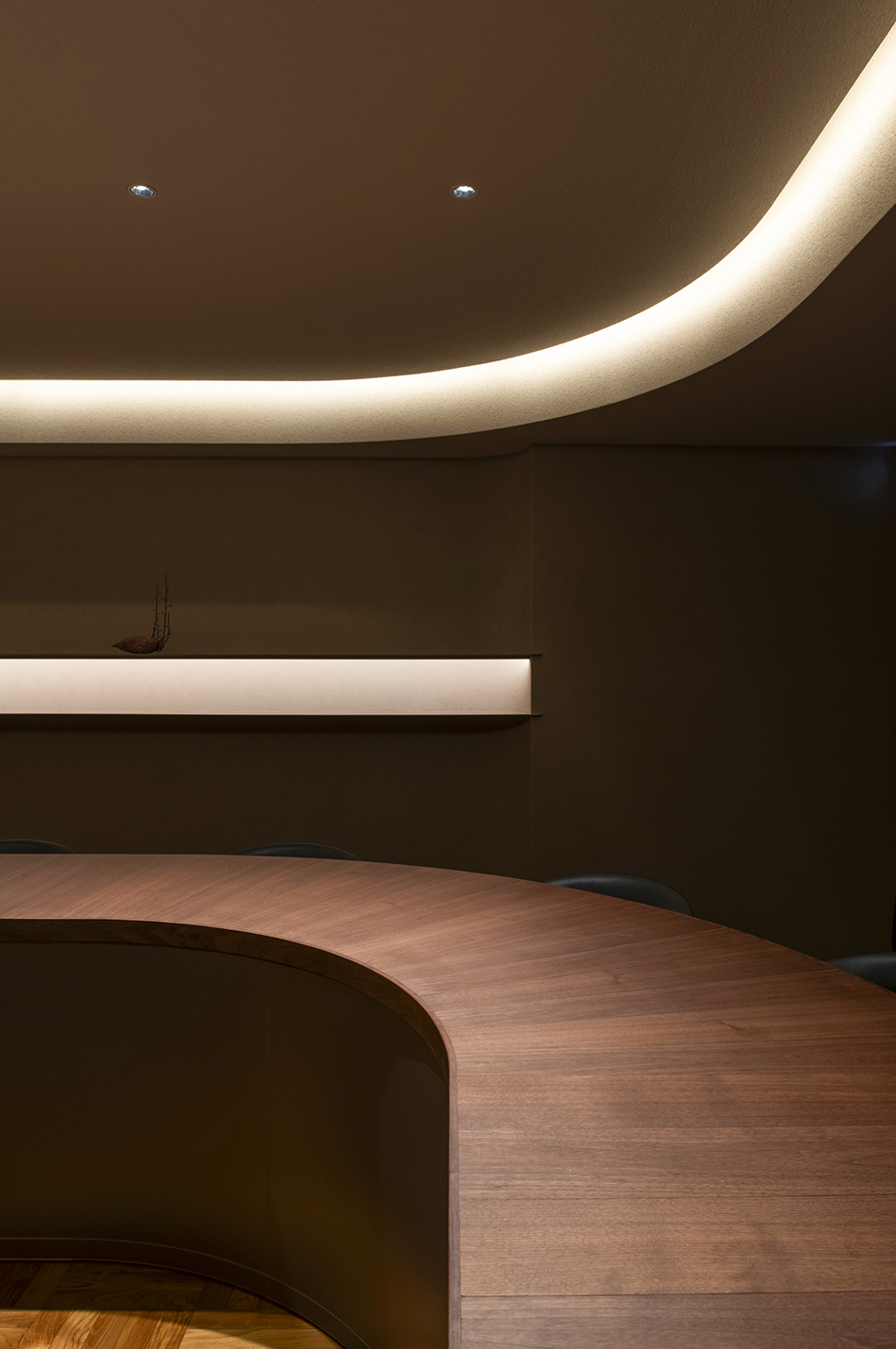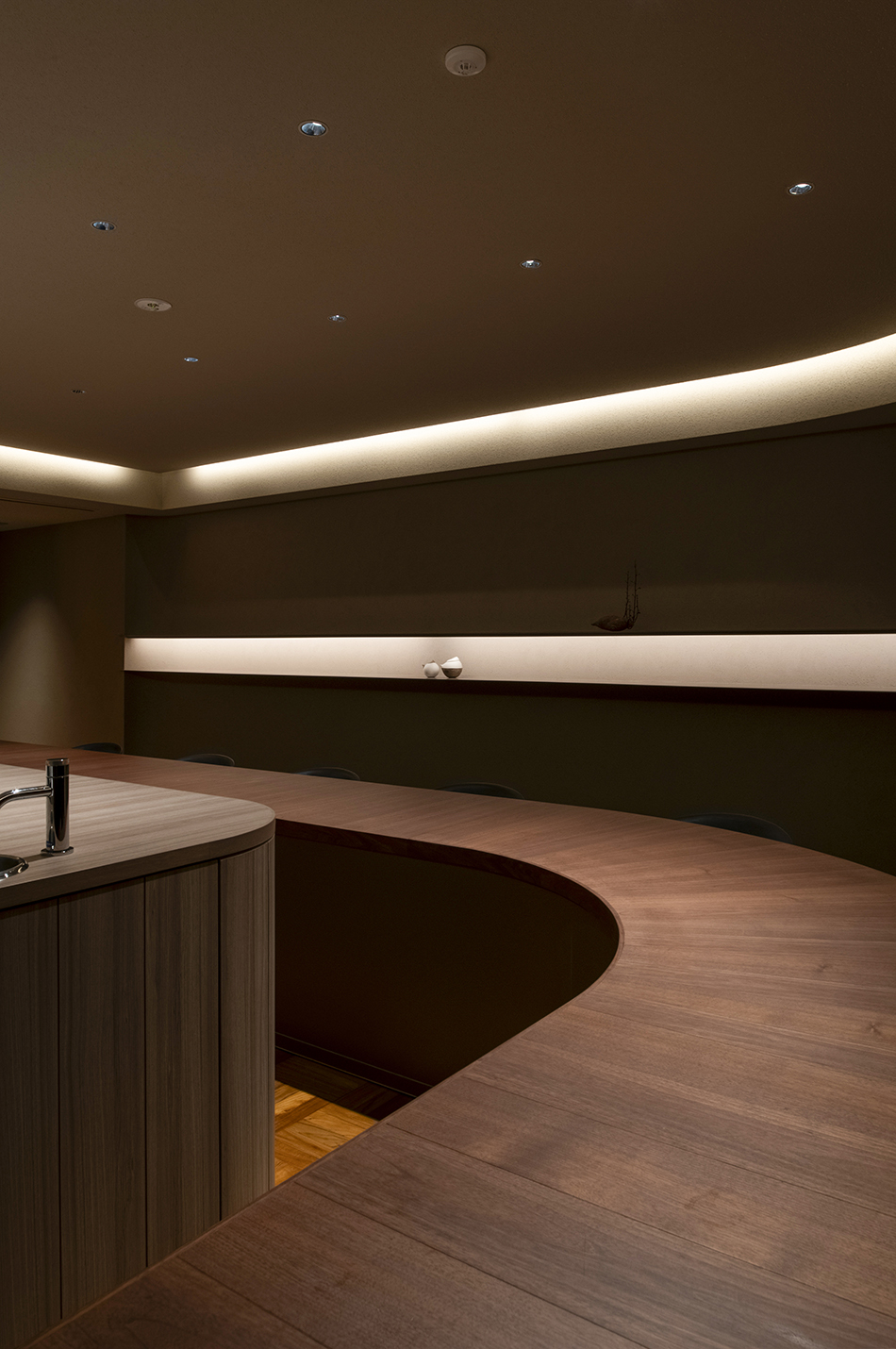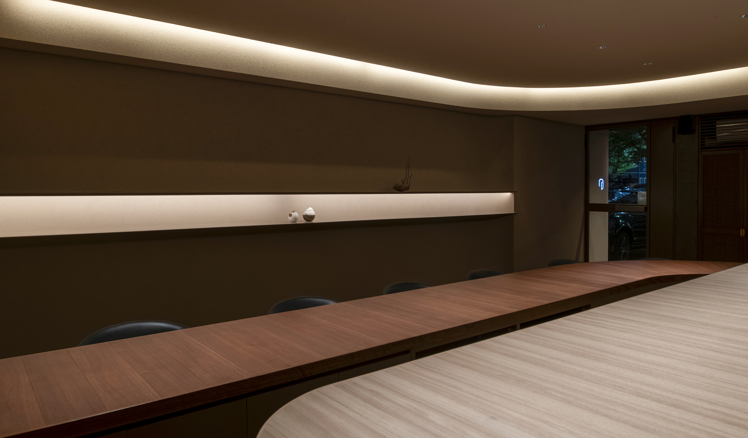 カーブの空間は食との感動の出会いの場として柔らかく店内を引き立てる。横田氏の創作の場を空間の中心に置き、アール形状のカウンターがそれを囲む事で一体感を生み提供される料理の過程を楽しむことができます。