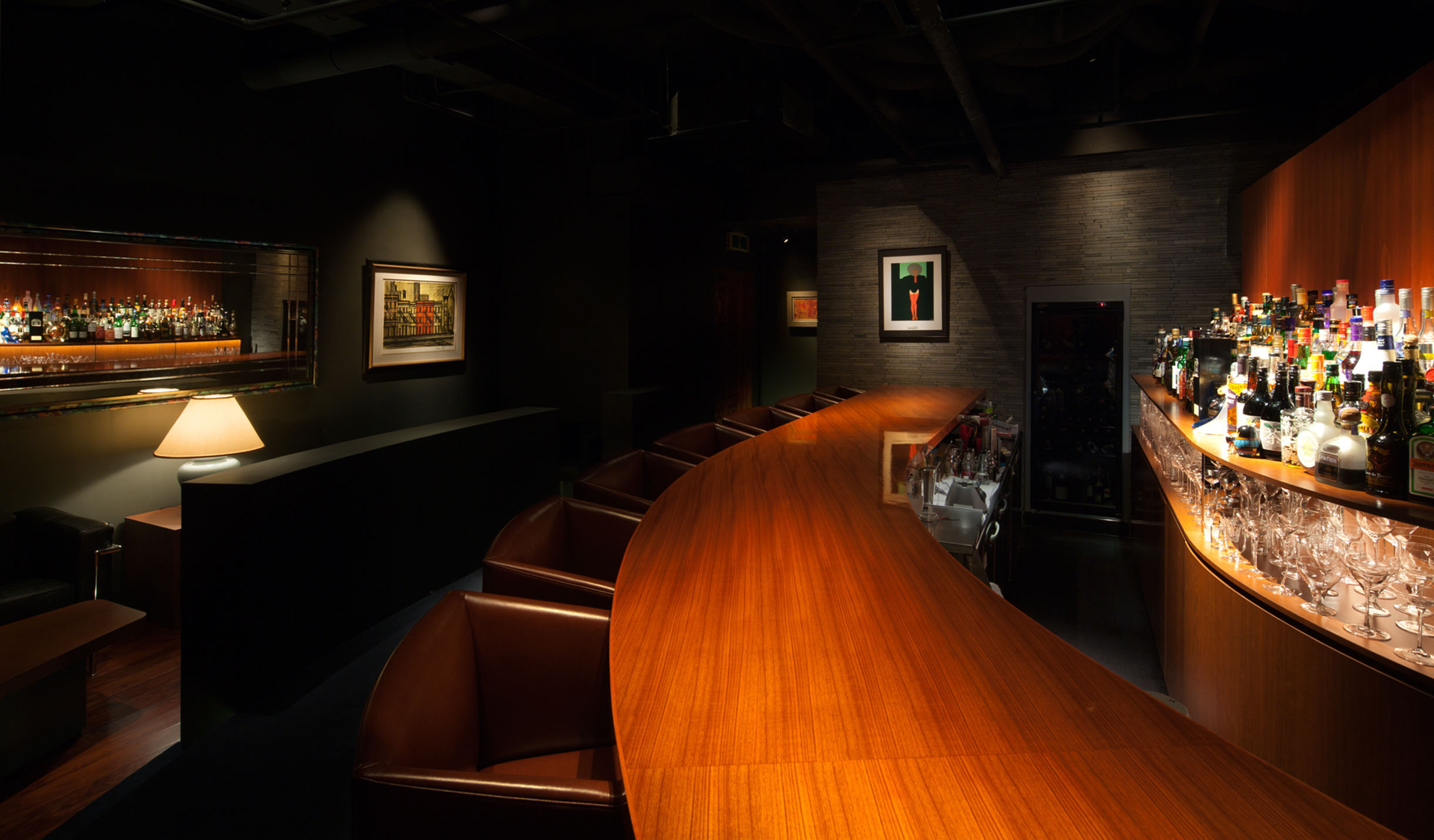 バックバーの壁面とカウンターは湾曲し奥へと広がりを感じさせ、チークの壁面とカウンターがシンプルに流れる。