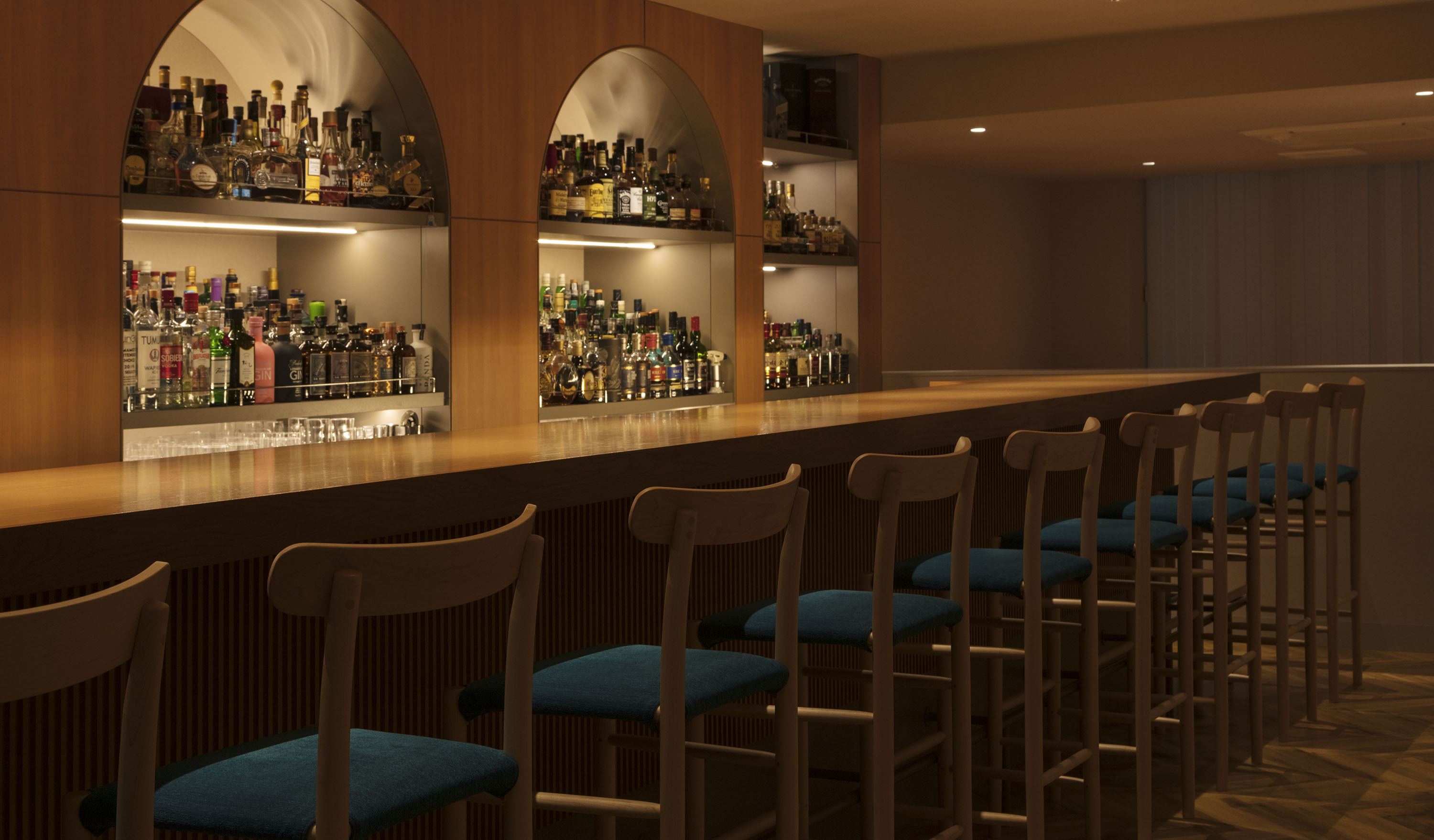 バックバー(お酒が並ぶ棚)の表情を繊細に柔らかい表情を作り、使用する樹種や光の操作をライトに設定しました。